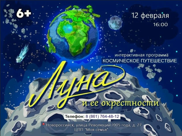 Приглашаем детей от 6 лет на интерактивную программу «Космическое путешествие» Новороссийск, ЦПП «Моя семья»,ул. Революции 1905 года, д. 27 Четверг, 12 февраля Время: 16:00 Для детей 6+ Что ждёт участников:Познавательные викторины о космосеИнтерактивные факты о планетах Солнечной системыПозитивные эмоции и новые друзья Количество мест ограничено! Запись обязательна. Телефон: 8(861)764-48-12 На